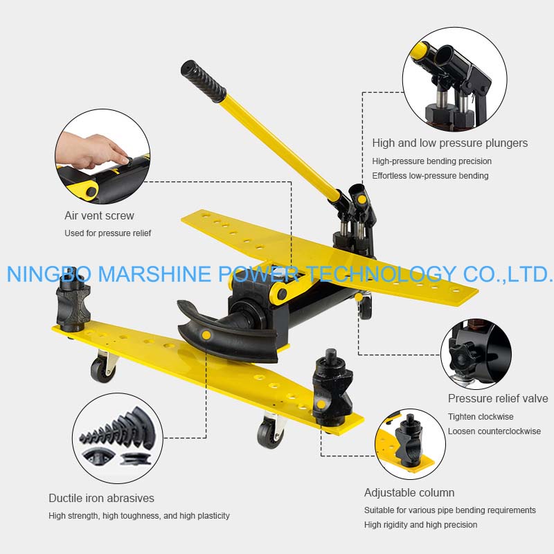 Cet équipement de cintrage de tuyaux hydrauliques de type manuel MARSHINE SWG permet une variété de matrices de cintrage pour différents diamètres de tuyaux utilisés dans la construction et les travaux électriques, etc.